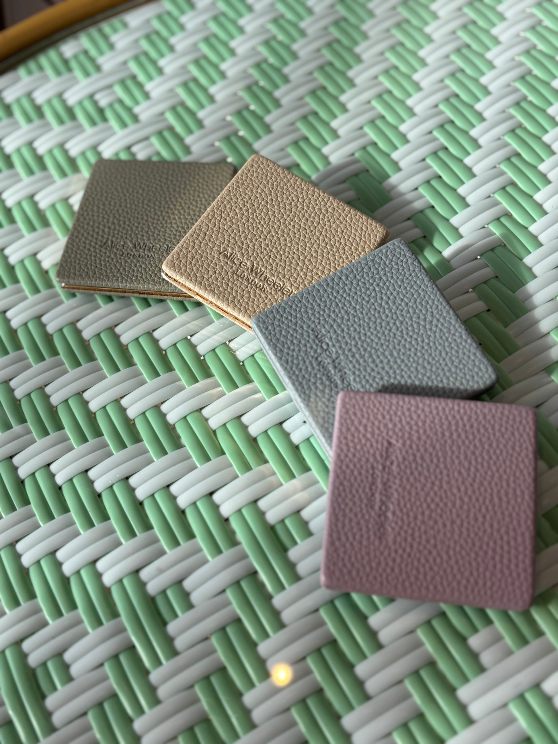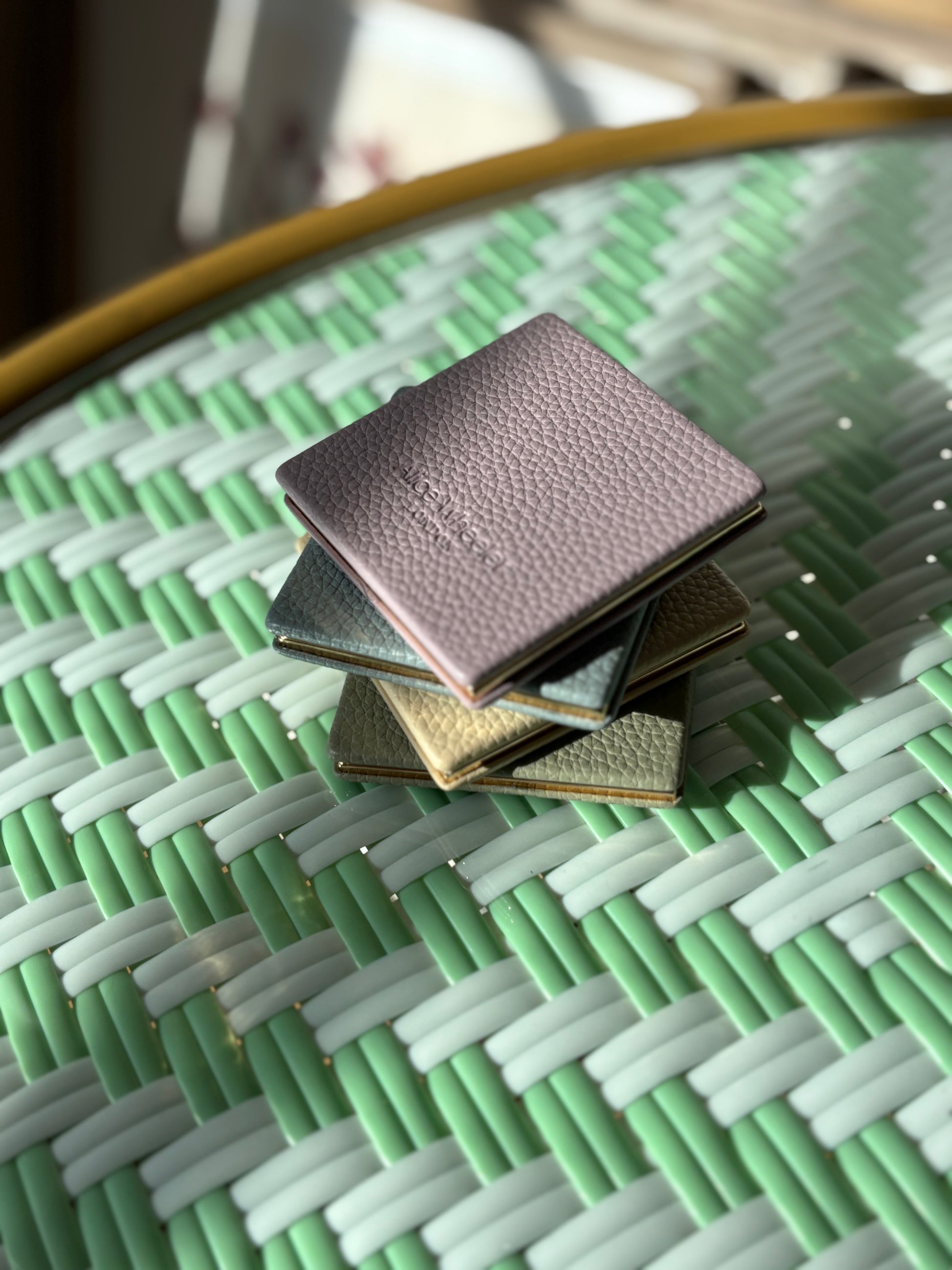 We are thrilled to introduce the Vienna Square Nappa Compact Mirror, a perfect blend of elegance and practicality. Encased in a soft vegan leather with a Nappa finish, this compact mirror is not only a statement of style but also a commitment to ethical fashion. Its ideal dimensions of 7.5W x 7.5H cm make it a seamless addition to your handbag