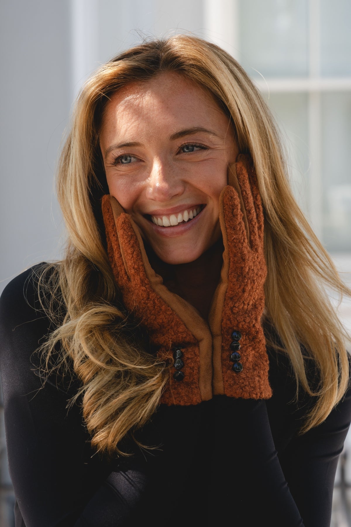 Faux suede gloves with a fluffy shirling effect and button detail. Touchscreen compatible index finger.